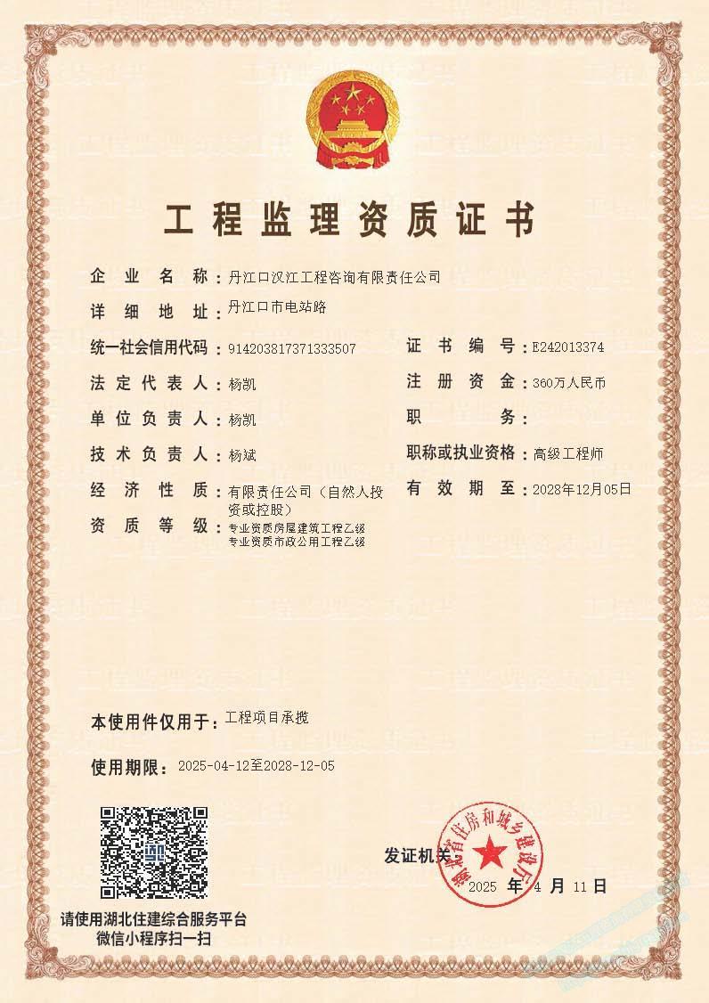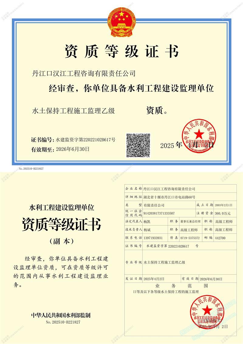 丹江口漢江工程咨詢有限責任公司 (原漢江綜合開發公司水利水電監理中心)成立于 1989年3月,1993年6月經水利部審批成為首批注冊監理單位 (隸屬于長江水利委員會), 注冊資本 360萬元 。公司位于湖北省十堰市丹江口市電站路。公司目前擁有水利部頒發的 水利工程施工監理甲級 、 水土保持工程施工監理 乙 級 資質 ;住建部頒發的 房屋建筑 、 市政公用工程監理 乙 級資質 。 可獨立承擔 各類水利水電工程 、 一般工業與民用建筑工程監理 , 土地整治 , 招標代理 、 技術咨詢 等業務。公司實行董事會領導下的總經理負責制,下設辦公室、經營部、財務部、工程技術部等職能部門。……